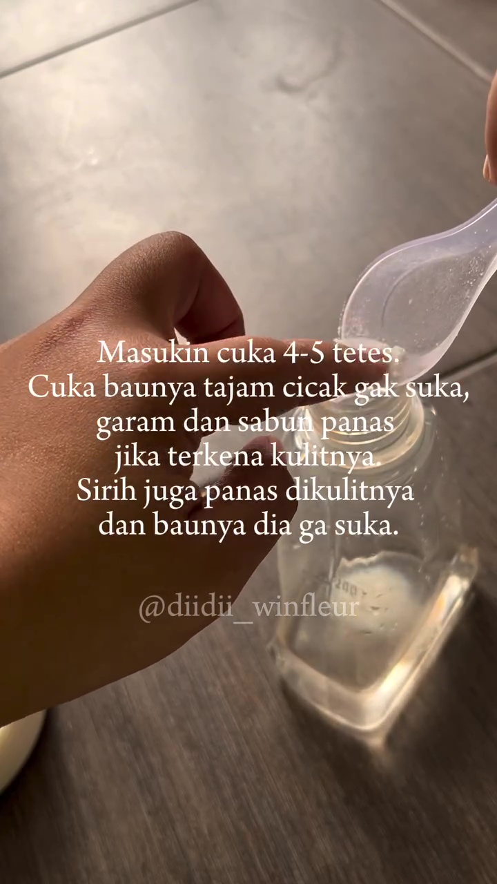 Sebelum digunakan, kocok botol spray agar semua bahan tercampur dengan baik. Kalau tidak dikocok, minyak dari daun sirih bisa mengendap di bawah dan cairannya jadi kurang efektif saat disemprotkan.
